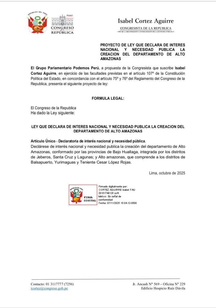 El Comité de Gestión para la creación del Departamento de Alto Amazonas obtuvo un nuevo respaldo en el Congreso de la República. La congresista Isabel Cortez Aguirre, representante de la región Lima, anunció que presentará un proyecto de ley que declara de interés nacional y necesidad pública la formación de este nuevo departamento, el cual estaría integrado por las provincias de Alto Amazonas —con los distritos de Yurimaguas, Balsapuerto y teniente César López— y Bajo Huallaga, conformada por Santa Cruz, Lagunas y Jeberos.