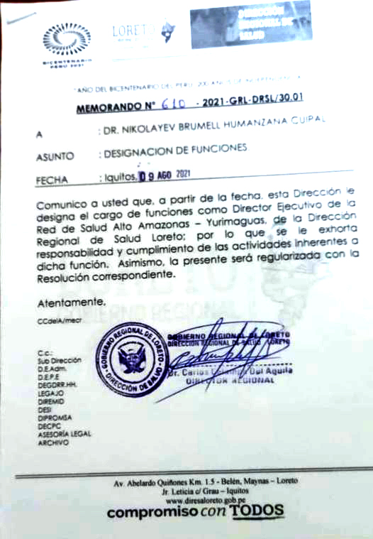 Cabe mencionar que ayer al medio día fue designado como DIRECTOR DE LA RED DE SALUD DE ALTO AMAZONAS YURIMAGUAS, el DR. NIKOLAYEV BRUMELL HUAMANZANA.