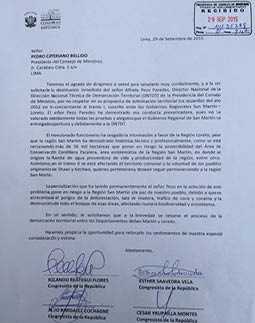 Los cuatro congresistas de San Martín mandaron un documento al primer ministro, Pedro Cateriano, pidiendo la destitución de Alfredo Pezo Paredes, director nacional de la Dirección Nacional Técnica de Demarcación Territorial, por su postura sesgada e imparcial ante el tema limítrofe entre los departamentos de San Martín y Loreto