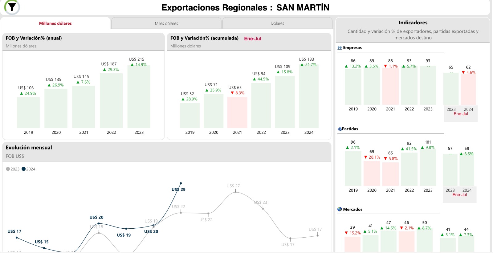 A la fecha, nuestra región exportó, en lo que va del año 2024, a estas regiones, mercancías por un valor FOB US$43,295 millones, siendo Chile el principal país hacia donde van nuestras exportaciones: El año 2023, exportamos a Chile mercancías por un valor FOB mayor a $34,000 millones y en lo que va del año 2024, el valor de nuestras exportaciones hacia ese país asciende a $14.256 millones.