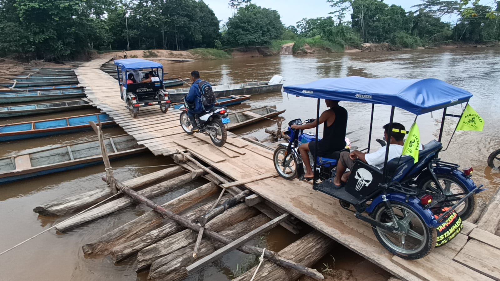 Colocaron tablas sobre once canoas amarradas y de esa manera lograron tener un puente provisional para facilitar la salida de sus productos, como papaya, palmito, pijuayo y arroz.
