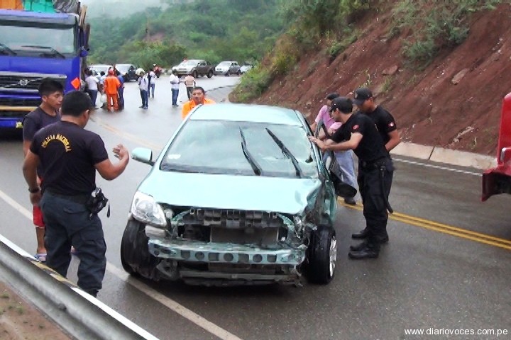 El accidente interrumpió el tránsito vehicular por varios minutos, personal de la Comisaría de Picota, remolcó el automóvil siniestrado a un costado de la vía, e intervino al chofer del camión para las investigaciones. (Hugo Anteparra)