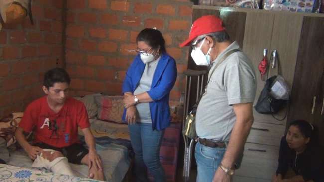 Representantes de la Cruz Roja de Moyobamba, el colectivo Alto Mayo y la Prefecta del departamento de San Martín visitaron el domicilio del joven Marlon Cumpe Moreto, quien sufriera un accidente de tránsito en la carretera a los baños termales, mientras realizaba trabajos de delivery.