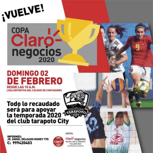 Vuelve la Copa Claro Negocios 5ta Edición, esta vez para apoyar la temporada del Club Tarapoto City. La fiesta deportiva se llevará a cabo el domingo 02 de febrero. Inscribe a tu equipo de Fulbito masculino y femenino. Premios, fiesta, gastronomía y muchos goles, se da conocer desde la dirigencia del Club Tarapoto City.