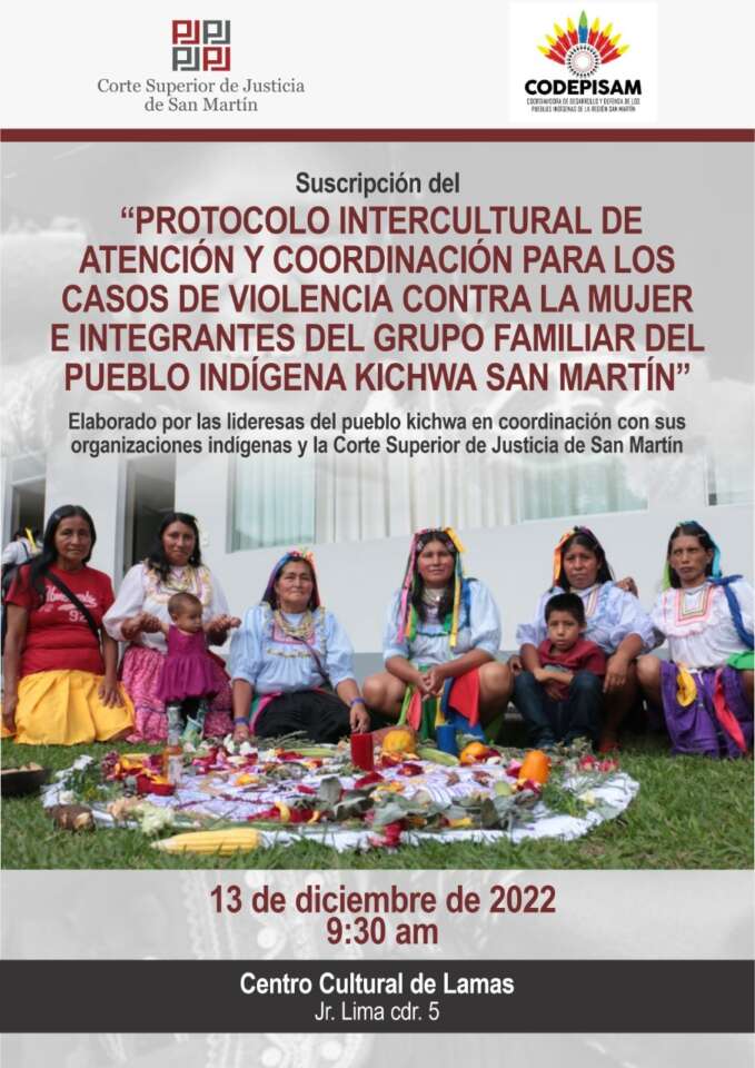 El presidente de la Corte Superior de Justicia de San Martín, Heriberto Gálvez Herrera y la Coordinadora de Desarrollo y Defensa de los Pueblos Indígenas de San Martín CODEPISAM), el Consejo Étnico de los Pueblos Kichwa de Amazonía (CEPKA), la Federación de Pueblos Indígenas Kechwa de Chazuta Amazonía (FEPIKECHA), la Federación de los Pueblos Indígenas Kichwa del Bajo Huallaga San Martín (FEPIKBHSAM), la Federación Kichwa Huallaga El Dorado (FEKIHD), la Federación de Comunidades Nativas Kechwa de El Dorado (FECONAKED) y la Federación de Pueblos Indígenas Kichwa Región San Martín (FEPIKRESAM), participarán este martes 13 de diciembre en la ciudad de Lamas del acto oficial para la firma de suscripción del “Protocolo Intercultural de Atención y Coordinación para los casos de Violencia contra la Mujer e Integrantes del Grupo Familiar del Pueblo Indígena Kichwa de San Martín”.