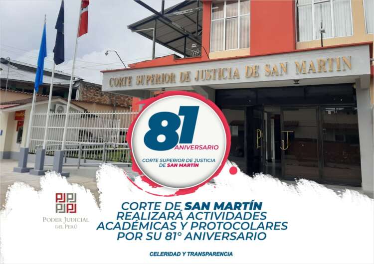 El próximo 02 de mayo del año en curso, la Corte Superior de Justicia de San Martín, celebrará su LXXXI Aniversario de instalación, con el desarrollo de importantes actividades académicas, protocolares, culturales, y de integración, en las que participarán los señores magistrados, personal jurisdiccional y administrativo, así como secigristas.