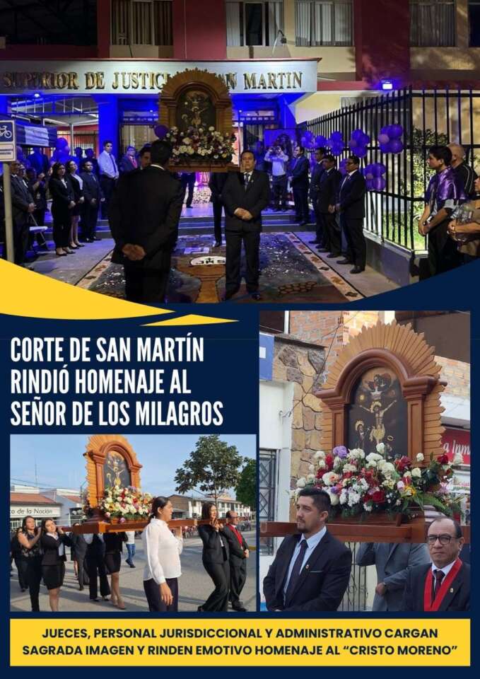 Por primera vez, cuadrilla de jueces y servidores judiciales, portó en hombros, la sagrada imagen del Señor de Los Milagros en un emotivo homenaje que realizó la Corte Superior de Justicia de San Martín al “Cristo Moreno” en el recorrido procesional. El presidente de la Corte Superior de Justicia de San Martín, Walter Francisco Ángeles Bachet, jueces superiores y de los demás niveles de la judicatura, funcionarios y servidores jurisdiccionales y administrativos, tributaron un cálido homenaje a la imagen del Señor de los Milagros acogiéndolo y venerándolo en las instalaciones de la sede central este distrito judicial de San Martín-Moyobamba, iluminado de color morado para esta ocasión, la noche del jueves 19 de octubre. En emotivo acto fue recibido, donde la autoridad judicial, Walter Francisco Ángeles Bachet le dio la bienvenida a la milagrosa imagen. El juez superior, Heriberto Gálvez Herrera, imploró por sabiduría para el cumplimiento de la difícil tarea de impartir justicia y suplicó al Señor de Los Milagros, protección para jueces, servidores y familiares de quienes integran la Corte de San Martín. En este lugar, el Cristo Morado fue recibido con aplausos, cánticos y oraciones, y un mensaje de reflexión cristiana. La devoción y fe a la imagen del Señor de Los Milagros, sirvió de inspiración a un nutrido grupo de servidores judiciales, quienes se lucieron con mucho colorido y creatividad en la elaboración de la alfombra y un camino de flores. El Cristo Morado llegó a las instalaciones de esta sede traído en anda por los estudiantes de la institución educativa Serafín Filomeno. De acuerdo al cronograma de la prelatura de Moyobamba, que este año incluye a las instituciones públicas en las festividades de devoción católica que se celebran en el mes morado, el último recorrido del Señor de los Milagros culminó en la Corte de San Martín. Finalmente, la mañana del viernes 20 octubre último la imagen fue trasladada en procesión hacia las instalaciones de la Iglesia Catedral de Moyobamba.