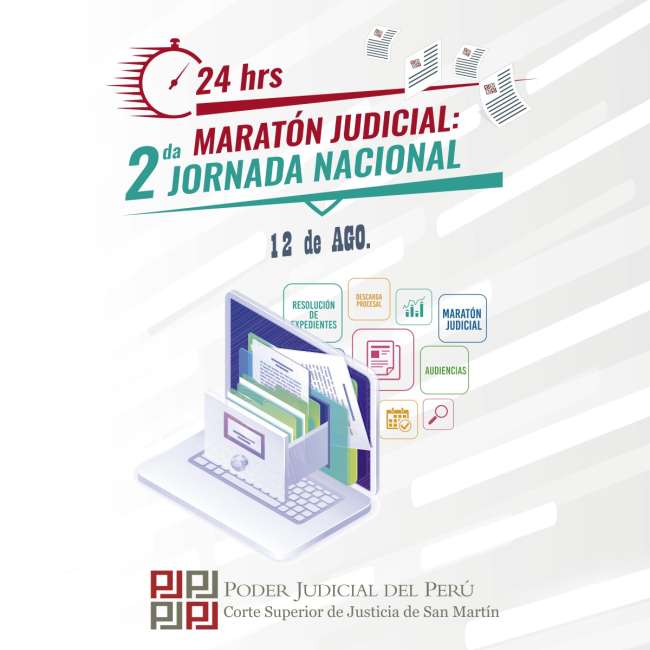 (Moyobamba, 10 de agosto de 2022).- El Poder Judicial realizará el próximo viernes 12 de agosto, la Segunda Jornada Nacional Judicial Extraordinaria 2022. Esta actividad, en la que será participe la Corte Superior de Justicia de San Martín, presidida por el magister Heriberto Gálvez Herrera, consiste en el desarrollo de audiencias, lectura de sentencias y otros actos procesales, durante 24 horas ininterrumpidas, tal como sucederá en la Corte Suprema y las 35 cortes superiores del país.