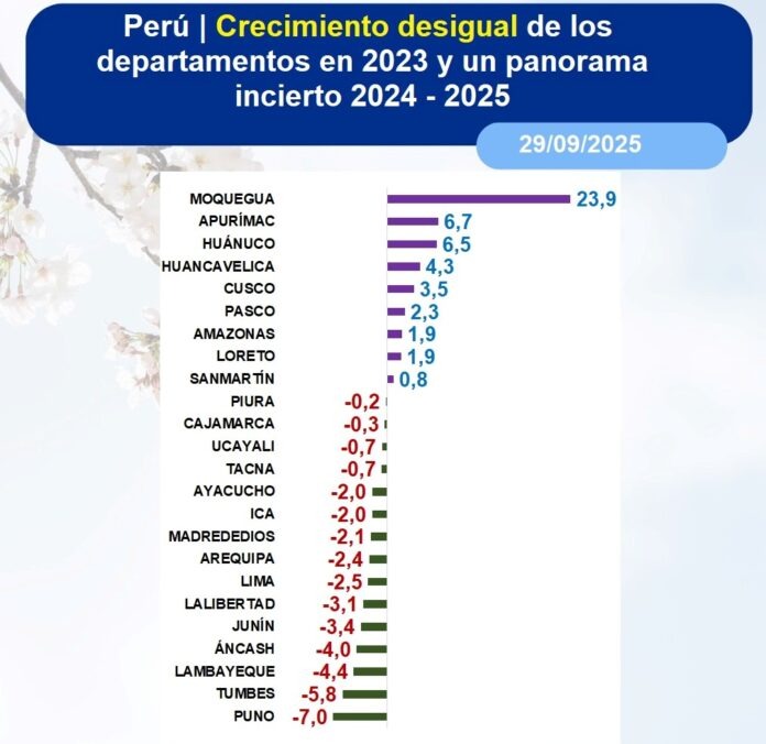 Un reciente análisis económico, basado en datos proyectados del INEI (2025), ha revelado el crecimiento desigual del Producto Bruto Interno (PBI) por departamentos en Perú durante el año 2023, en el marco de un panorama incierto para 2024-2025. El informe subraya la gran disparidad regional, con algunas zonas experimentando un auge notable mientras que la mayoría registró caídas significativas en su actividad económica.