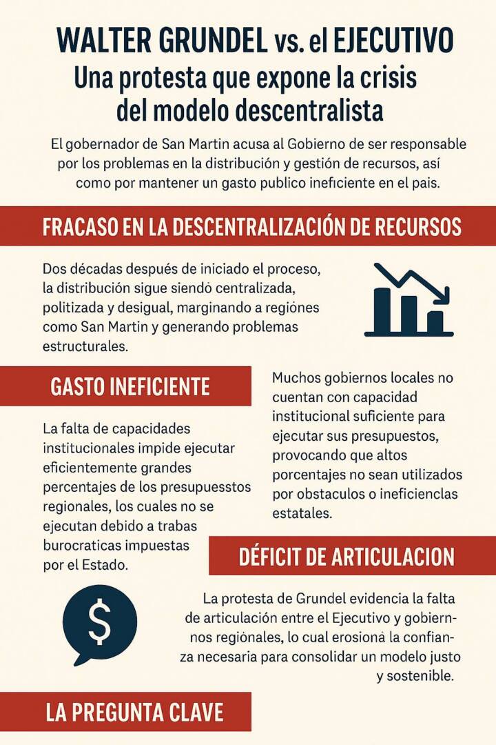 Grundel sostiene que el Estado ha demostrado ser incapaz de distribuir equitativamente los recursos públicos, dejando a regiones como San Martín sin el presupuesto necesario para atender las múltiples demandas sociales, económicas y ambientales. Esta acusación reabre el debate sobre el modelo descentralista implementado en el país hace más de veinte años.