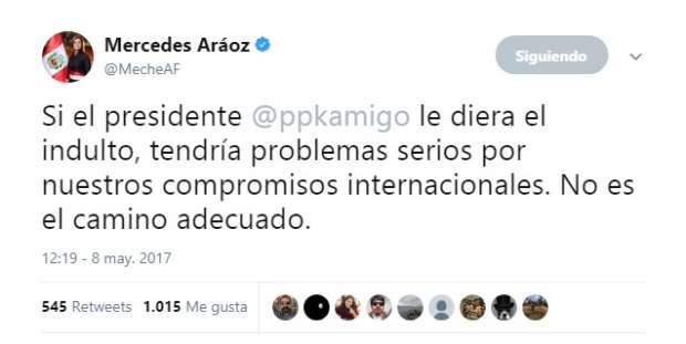 Una sutil ola de críticas y cuestionamientos cayeron sobre la premier Mercedes Aráoz en Twitter luego de que decenas de usuarios comenzara a retuitear sus comentarios del 2016 respecto al indulto a Alberto Fujimori y sobre el fujimorismo, en disputa entonces por la presidencia del Perú representada en la segunda vuelta que enfrentó a Pedro Pablo Kuczynski con Keiko Fujimori. Los comentarios de la premier revelan el cambio de su opinión. Entonces, los actos de Alberto Fujimori eran “delitos que tipifican como lesa humanidad”, lo cual, según los tratados internacionales a los que el Perú está adscrito, imposibilitarían el indulto humanitario.