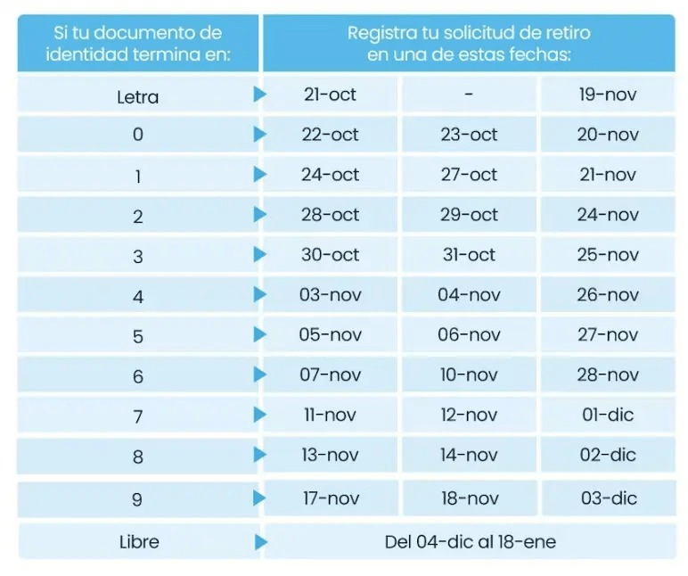 Además, el cronograma contempla un periodo libre, durante el cual cualquier afiliado podrá realizar su solicitud, sin importar el número de su documento. Este periodo irá del jueves 4 de diciembre de 2025 al viernes 16 de enero de 2026, último día hábil para tramitar el retiro de fondos.