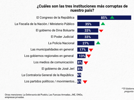 El impacto más severo de este escenario es el colapso de la confianza en las instituciones del Estado. Cuando se pregunta a la ciudadanía cuál es la institución más corrupta del país, la respuesta es contundente: el Congreso de la República. De acuerdo con Proética, el 85% de los peruanos señala al Congreso como la institución más corrupta, seguido por la Fiscalía de la Nación (35%), el Poder Judicial (33%) y la Policía Nacional del Perú (33%). Paradójicamente, son estas mismas entidades las que la población espera que lideren la lucha contra la corrupción.