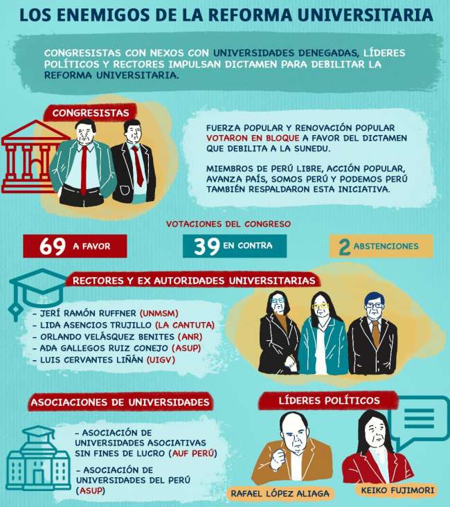 Entre 2019 y 2021, la Superintendencia Nacional de Educación Superior del Perú (Sunedu) ha sancionado al menos a cinco universidades privadas por usar de forma indebida sus recursos. Las Universidad de San Martín de Porres, la Universidad Inca Garcilaso de la Vega, la Universidad Alas Peruanas, la Universidad Señor de Sipán y la Universidad La Salle. De ellas, solo la última ha pagado su multa, las demás suman una deuda de S/ 30’801.708 en total, por haber empleado sus activos para fines no educativos.