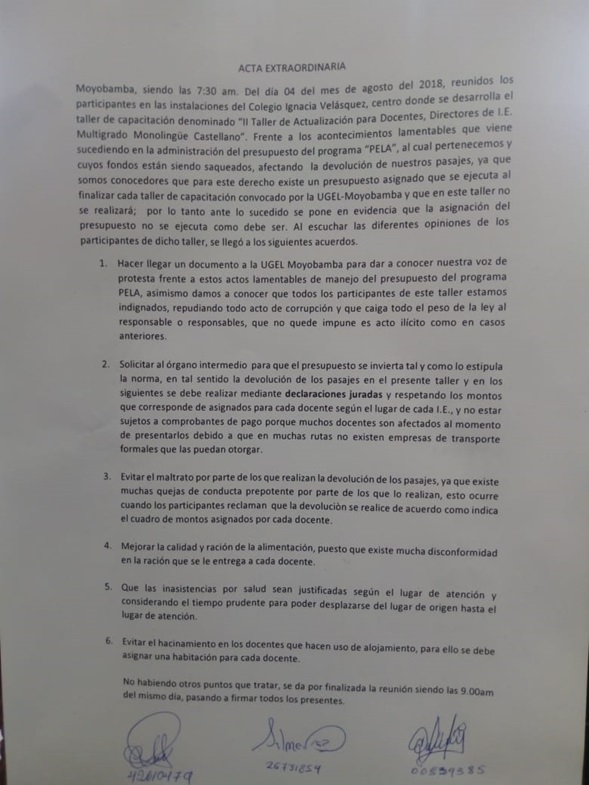 En el documento rechazan todo acto de corrupción que vienen ocurriendo en el manejo del presupuesto del Programa Logros de Aprendizajes – PELA, asimismo solicitaron al órgano intermedio para que el presupuesto se invierta tal y como lo estipula la norma, también denunciaron los maltratos al magisterio ya que mientras en la Dirección Regional de Educación se roban el dinero, a ellos no les brindan las condiciones adecuadas para su capacitación.