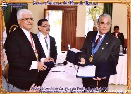 Trujillo. En ceremonia especial realizada en la ciudad de Trujillo, con la presencia de los rectores miembros de la Asamblea Nacional de Rectores, la Universidad Católica de Trujillo Benedicto XVI declaró Visitante Ilustre con la entrega de la Distinción Benedicto XVI al Doctor Alfredo Quinteros García, rector de la Universidad Nacional de San Martín.