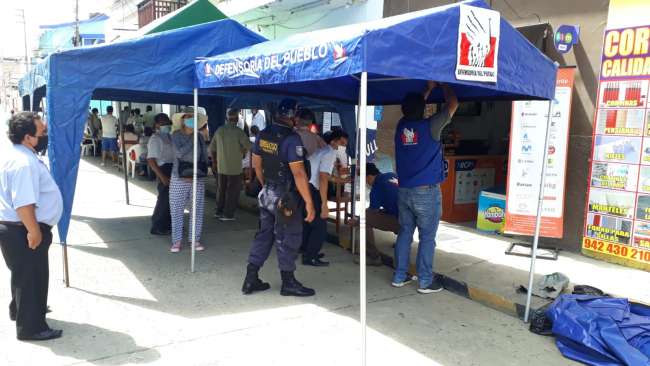 La Defensoría del Pueblo en esta jornada instaló carpas para brindar mayor comodidad y evitar insolación a las personas de la tercera edad y discapacitados, quienes estarían expuestos a contagiarse del Covid 19, situación que se espera evitar dando cumplimiento a las recomendaciones de bioseguridad decretadas por el gobierno.