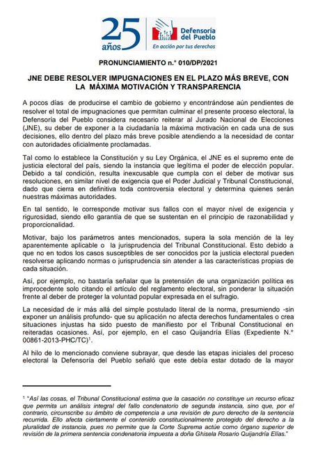 A pocos días del cambio de gobierno y encontrándose pendientes de resolver un número significativo de impugnaciones que permitan culminar el presente proceso electoral, la Defensoría del Pueblo reiteró que el Jurado Nacional de Elecciones (JNE) debe resolverlas en el más breve plazo posible.