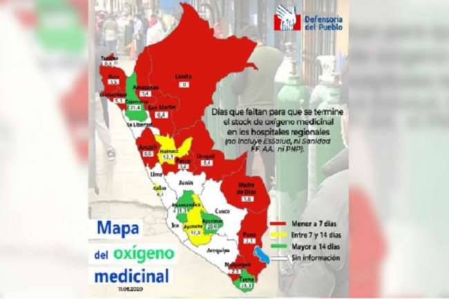 La Defensoría del Pueblo ha elaborado el Mapa Regional del Oxígeno Medicinal, a fin de articular las acciones del Estado en relación a la disponibilidad de este insumo. Con la información que ha recabado, la institución calculó el número de días que falta para agotar el stock de oxígeno medicinal en las regiones del país y suman 12 las que poseen menos de una semana de stock.