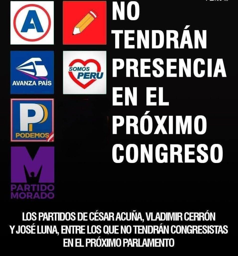 En la lista de los más golpeados figuran Alianza para el Progreso (APP), Podemos Perú, Perú Libre, Avanza País, Acción Popular y Somos Perú, organizaciones que fueron protagonistas del último quinquenio legislativo y que hoy registran una drástica caída en su respaldo ciudadano.