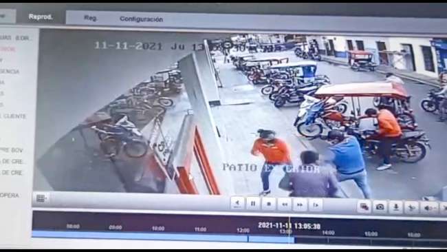 En los registros de la cámara de videovigilancia al parecer de la propia agencia, se ve que, a bordo de una moto lineal, dos trabajadores de la entidad financiera llegan hasta el frontis de su local, y segundos que la señorita baja de la moto cogiendo la mochila que según trascendió había en su interior más de 140 mil soles, que minutos antes habían retirado de un banco, aparecen dos sujetos, quienes con pistola en mano tras un breve forcejeo le arrebatan a la mujer la mochila y su bolso personal, para luego huir en las motos, cuyos cómplices les esperaban con el motor en funcionamiento.