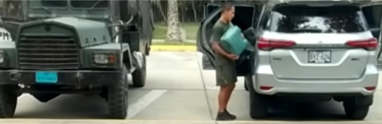 En una serie de videos difundidos por el programa dominical, se ve como el militar quita el combustible de vehículos conocidos como “comancar” del Cuartel General del Ejército, y lo almacena en contendedores que se usarían luego para abastecer los automóviles de oficiales y suboficiales.