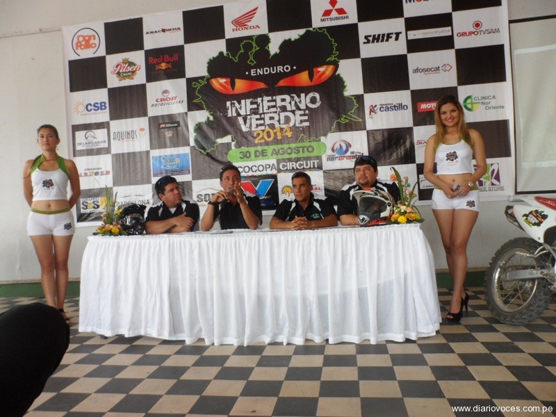 Ayer en conferencia de prensa en la que se brindo información detallada de lo que será el Enduro Infierno Verde 2014 Tarapoto – Perú, fue en las instalaciones del Club Social San Martin, aprovechamos la ocasión para conversar con Erick Roca Valera, uno de los rostros más representativos de toda la organización de esta competencia “Estamos seguros que el público acudirá y participará activamente durante los dos días que durará el evento, es decir empezando el viernes 29 en la Concha Acústica a partir de las 7 de la noche en donde será la presentación de los pilotos que participaran con sus respectivas máquinas, tendremos una partida simbólica igualmente un colorido pasacalle ya el día sábado 30 estaremos en el Cocopa Circuit desde las 9 de la mañana en la partida y llegada pero los asistentes podrán participar de una serie de actividades que tendrá la elección de Señorita Infierno Verde, además de un amplio patio de comidas con la presencia de 4 reconocidos restaurant de la ciudad, lo demás son actividades exclusivamente vinculadas a la competencia en si”.