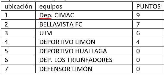 Tras el magro empate de Bellavista FC con Deportivo Limón de 2 a 2 y el triunfo inobjetable del Deportivo Cimac por 5 a 1 a Defensor Limón y habiendo sumado sus 9 puntos en la tabla de colocaciones y mantener el invicto, la escuadra del Deportivo Cimac tomó la punta en la tercera fecha de la copa Perú-distrital en Bellavista.