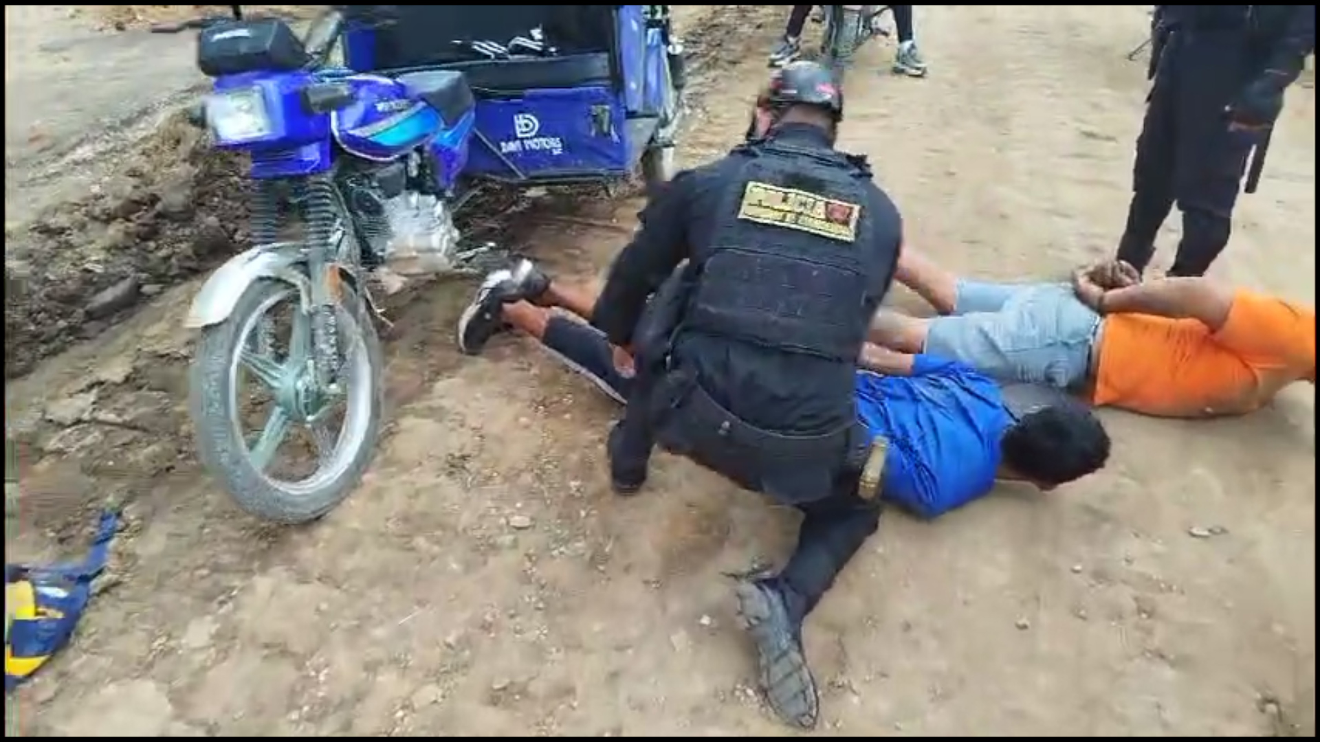 Gracias a la oportuna denuncia de los agraviados y a la rápida reacción de los efectivos policiales, se implementó un operativo cerco que permitió la captura de tres integrantes de la supuesta banda en el sector de Indañe. Los detenidos fueron identificados como Ever Coronel Altamirano (29), Segundo Marcial Leyva García (39) y un menor de 17 años de iniciales JPOC. Durante la intervención, se incautó un arma de fuego marca Bersa Thunder 380, abastecida con ocho municiones.