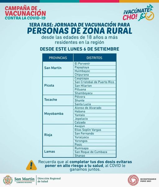 Las autoridades de salud han dado a conocer que todos los residentes sanmartinenses de la ZONA RURAL de la región desde este lunes 6 de septiembre deben asistir a los centros de vacunación autorizados en cada uno de los distritos considerados en la publicación.
