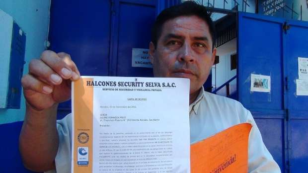 La carta de despido está firmada por Luis Alberto Sánchez Najar como gerente general de Los Halcones Segurity, quien evita responder a la prensa sobre este hecho. Por su parte Gildre Espinoza denunciará despido arbitrario ante la Dirección Regional de Trabajo y Promoción del Empleo para evitar que sus compañeros sean despedidos. (Hugo Anteparra)