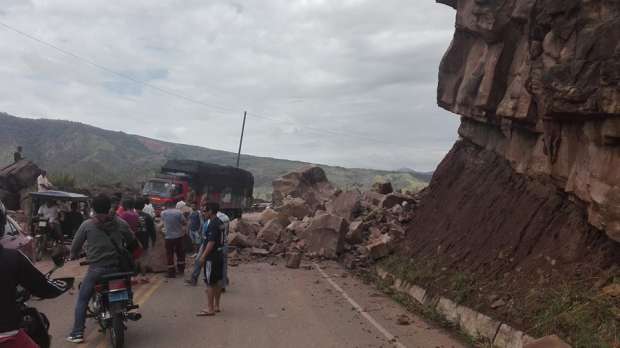 Varias rocas se desprendieron ayer por la mañana en el sector Abra Machungo de la carretera Fernando Belaúnde Terry, ubicado a 31 kilómetros al sur de Tarapoto, el hecho se produjo a consecuencia de la persistente lluvia que cayó en la zona durante casi todo el día.