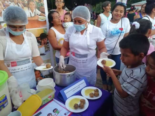 Mediante una feria informativa, el Ministerio de Desarrollo e Inclusión Social (Midis), a través del Programa Nacional de Alimentación Escolar Qali Warma, presentó a los pobladores del distrito de Rumisapa, provincia de Lamas, los nutritivos productos que consumen los niños y niñas de la región San Martín en el desayuno y almuerzo escolar.