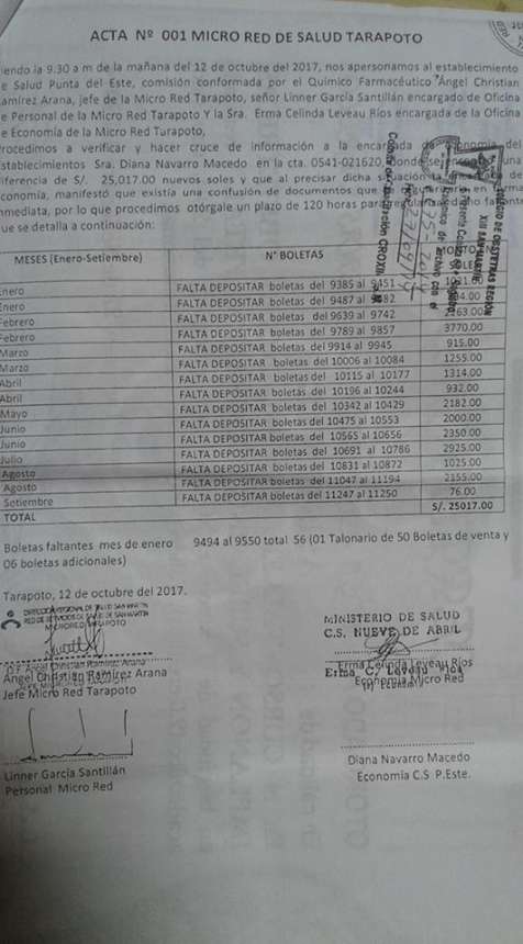 A través de informe de la jefatura de la Microred de Salud Tarapoto, la dirección de la Red de Servicios de Salud de San Martín ha recibido documentación relacionada a una denuncia, donde da cuenta de la desaparición de forma sistemática de más de 25 mil soles que corresponden a faltantes por depósitos no efectuados, que compromete a una trabajadora del Puesto de Salud Punta del Este, además de otros que allí laboran, así como a trabajadores que forman parte de procedimientos administrativos de control de la unidad y establecimientos jerárquicos correspondientes, ya que se habla de un faltante que data desde inicios de este año, por lo tanto, no solo estaría comprometida una sola persona a quien se alude como autora del desfalco directamente.