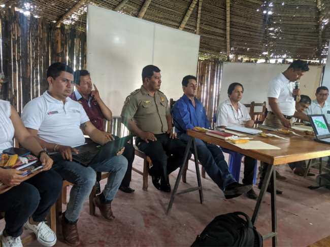 La reunión se ha llevado a cabo el lunes 17 de octubre en las instalaciones de la FERIAM. Asistieron a esta reunión mi persona en condición de Comisionado Secretaria de Gestión Social y Diálogo de la Presidencia del Consejo de Ministros; Juan Antonio Urbina Puzcán, Gestor Territorial San Martín de la Dirección de Prevención y Gestión de Conflictos Sociales del Ministerio del Interior; Mayor PNP Joel Ramos Flores, Comisario Uchuglla DIVPOL PNP Moyobamba; Jaimito Azang Huamán, jefe de la Oficina de Dialogo y Sostenibilidad del GORESAM; Lucy Chumbe Rodríguez, sub directora Dirección Desconcentrada de Cultura San Martín; Buenaventura Ríos Ríos, asesor GORE San Martín; Kelly Zaquinaula Guerrero, especialista legal de Oficina Defensorial San Martín; Jorge Mori Vela, subprefecto provincial Moyobamba; Domenica Berru Chávez, especialista de la Autoridad Local del Agua subcuenca Río Mayo; Edward Cahuaza Juep, el Presidente Federación Regional Indígena Awajun del Alto Mayo; Gil Inoach Shawit, además del presidente Gobierno Territorial Autónomo Awajún; Willy Palomino Castro de Conservación Internacional; Porfilio Yagkitai Wajai, jefe CN Huascayacu; Filemon Sanchium Chamik, jefe de CN Shimpiyacu; más de 8 APUS y líderes de diversas Comunidades Awajun del Alto Mayo y Loreto, resaltando la presencia y participación de Noe Cahuaza Nashampi, apu de Bajo Naranjillo; Mercedes Cabrera Peas, Fiscal FERIAAM y comuneros nativos, teniendo como único punto de la agenda: las invasiones en las comunidades nativas