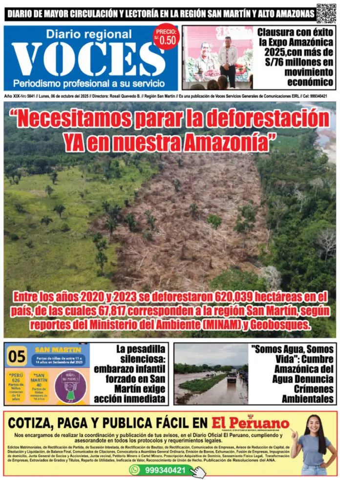 InicioActualidad ActualidadDiario Digital Diario Digital, lunes 06 de octubre 2025 By Voces 06/10/2025 2 FacebookTwitterWhatsAppLinkedinTelegram TagsDiario Digital Cuota FacebookTwitterWhatsAppLinkedinTelegram Artículo anteriorHuachitas, sábado 04 de octubre 2025Artículo siguiente“Necesitamos parar la deforestación ya en nuestra Amazonía” Artículos relacionados Actualidad Selección del Diario Judicial de San Martín: ¿Transparencia en entredicho? Actualidad «Somos Agua, Somos Vida»: Cumbre Amazónica del Agua Denuncia Crímenes Ambientales y Llama a una Gran Alianza por la Vida Actualidad San Martín clausura con éxito la ExpoAmazónica 2025 con más de S/ 76 millones en movimiento económico Mantente conectado34,742FansMe gusta478SeguidoresSeguir1,851SeguidoresSeguir ÚLTIMOS ARTÍCULOS Actualidad Selección del Diario Judicial de San Martín: ¿Transparencia en entredicho? Actualidad «Somos Agua, Somos Vida»: Cumbre Amazónica del Agua Denuncia Crímenes Ambientales y Llama a una Gran Alianza por la Vida Actualidad San Martín clausura con éxito la ExpoAmazónica 2025 con más de S/ 76 millones en movimiento económico Actualidad “Necesitamos parar la deforestación ya en nuestra Amazonía” Cargar más