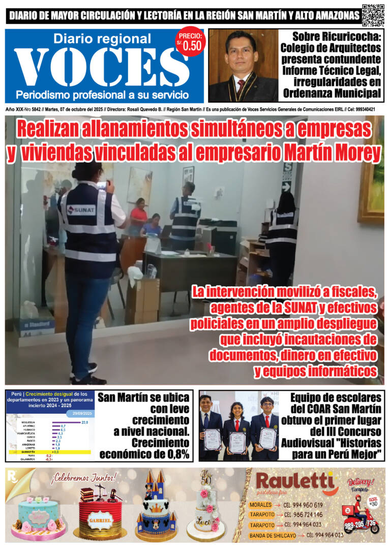 InicioActualidad ActualidadDiario Digital Diario Digital, martes 07 de octubre 2025 By Voces 07/10/2025 4 FacebookTwitterWhatsAppLinkedinTelegram TagsDiario Digital Cuota FacebookTwitterWhatsAppLinkedinTelegram Artículo anteriorPortada, martes 07 de octubre 2025Artículo siguienteRealizan allanamientos simultáneos a empresas y viviendas vinculadas al empresario Martín Morey Rivas Artículos relacionados Actualidad Huachitas, martes 07 de octubre 2025 Actualidad EMAPA San Martín continua con limpieza de alcaltarillado Actualidad EMAPA San Martín inicia instalación de medidores Mantente conectado34,742FansMe gusta478SeguidoresSeguir1,851SeguidoresSeguir ÚLTIMOS ARTÍCULOS Actualidad Huachitas, martes 07 de octubre 2025 Actualidad EMAPA San Martín continua con limpieza de alcaltarillado Actualidad EMAPA San Martín inicia instalación de medidores Actualidad Diresa San Martín fortalece lucha contra el dengue inspeccionando más de 4100 viviendas de Mariscal Cáceres Cargar más