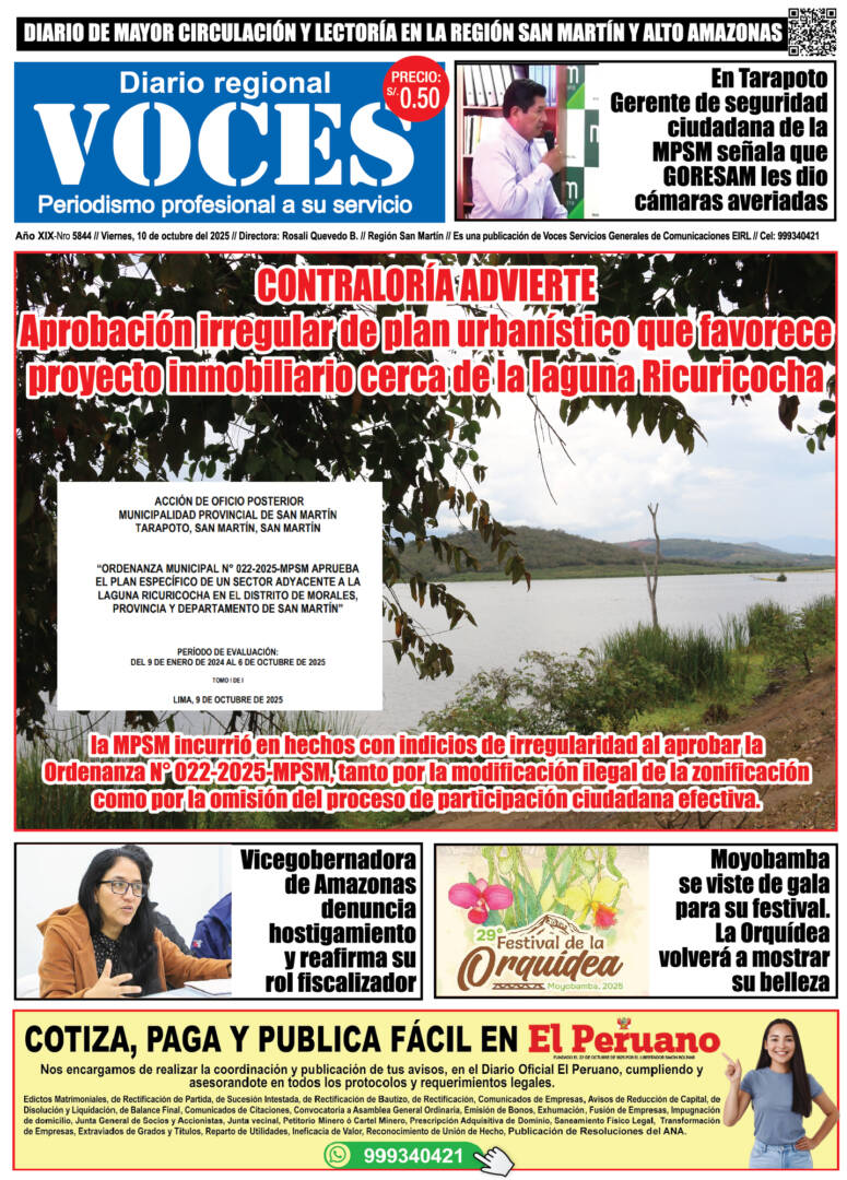 InicioActualidad ActualidadDiario Digital Diario Digital, viernes 10 de octubre 2025 By Voces 10/10/2025 3 FacebookTwitterWhatsAppLinkedinTelegram TagsDiario Digital Cuota FacebookTwitterWhatsAppLinkedinTelegram Artículo anteriorPortada, viernes 10 de octubre 2025Artículo siguienteCámaras de videovigilancia entregadas por el Gobierno Regional a la MPSM continúan inoperativas Artículos relacionados Actualidad Supervisiones del OSINFOR fortalecen cadenas forestales y agroforestales legales en la Amazonía Actualidad Altos funcionarios tienen hasta el 13 de octubre para renunciar si desean postular a las Elecciones Generales 2026 Actualidad Proyecto Huallaga avanza con asfaltados en el Barrio Huayco: trabajos se realizan en el jirón Tacna Mantente conectado34,742FansMe gusta478SeguidoresSeguir1,851SeguidoresSeguir ÚLTIMOS ARTÍCULOS Actualidad Supervisiones del OSINFOR fortalecen cadenas forestales y agroforestales legales en la Amazonía Actualidad Altos funcionarios tienen hasta el 13 de octubre para renunciar si desean postular a las Elecciones Generales 2026 Actualidad Proyecto Huallaga avanza con asfaltados en el Barrio Huayco: trabajos se realizan en el jirón Tacna Actualidad Detienen a mujer por microcomercialización de droga en Tocache Cargar más