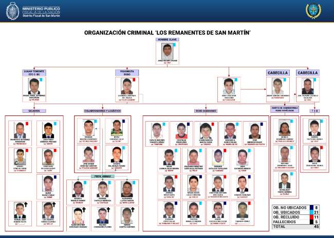 La Fiscalía Provincial Especializada en Criminalidad Organizada de San Martín, consiguió que se imponga 36 meses de prisión preventiva para 22 integrantes de una presunta red criminal denominada ‘Los Remanentes de San Martín’, la cual, desde el año 2013 hasta la actualidad, habría operado en cuatro facciones vinculadas al gremio de construcción civil, en la provincia de Mariscal Cáceres, San Martín.