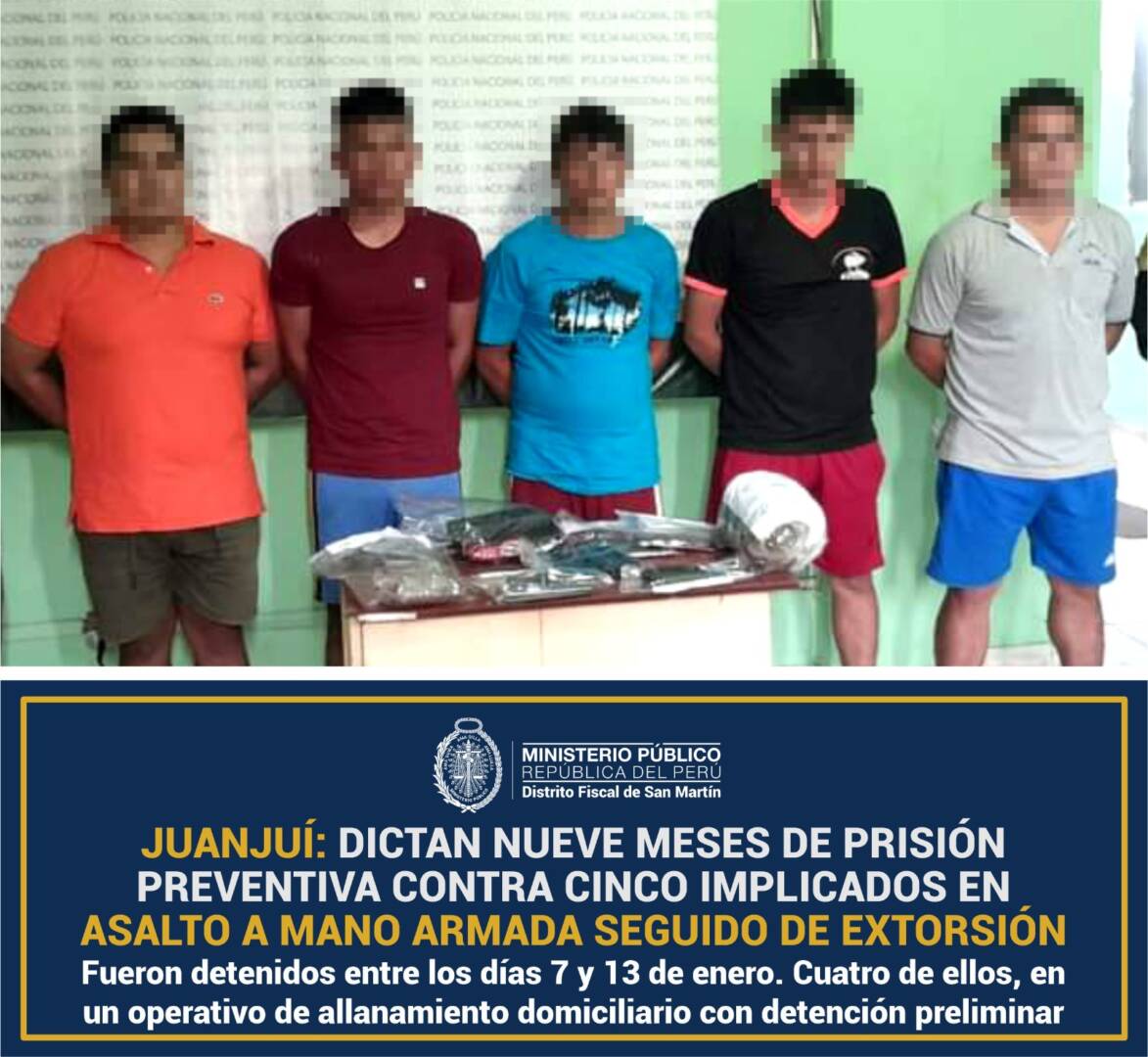 La Fiscalía Provincial Penal Corporativa de Mariscal Cáceres logró nueves de prisión preventiva contra cinco implicados en un asalto a mano armada seguido de extorsión, en agravio de un ciudadano a quien despojaron de dinero y su teléfono celular, cuando se traslada desde la ciudad de Juanjuí, al distrito del Eslabón, provincia de Huallaga.