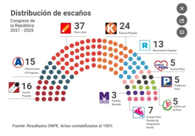 De los 130 parlamentarios, Perú Libre tiene 22 parlamentarios con estudios de posgrado, 10 con estudios superiores y 5 con secundaria; Fuerza Popular 12 con posgrado, 8 con estudios superiores y 4 con secundaria; Acción popular 8 con estudios de posgrado, 6 superior y 2 con secundaria; APP 9 posgrado y 6 superior.