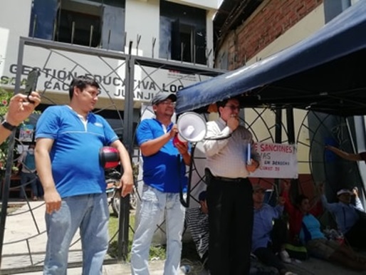 Juanjui. Luego que un gran número de profesores sancionados por haber acatado la huelga docente el año pasado, hiciera un plantón frente al local de la UGEL Mariscal Cáceres, algunos de ellos encadenados, llegó a esta ciudad el director regional de Educación Prof. Orlando Vargas Rojas quién, de inmediato, estableció una reunión de trabajo con los dirigentes del SITEMAC Juanjui y que contó también con la presencia del presidente del Frente Cívico y de Defensa de los intereses de Mariscal Cáceres Prof. Arístides Mejía Cercado, el representante de los trabajadores de construcción civil Lugo Fasabi el dirigente histórico del magisterio provincial Prof. Crómwell Salinas Vásquez, donde se abordó el tema de la sanción impuesta por el director de la UGEL Lic. Álember Cotrina Hernández de 31 días de suspensión sin goce de remuneración a más de 48 docentes de un total de 300 profesores, dejando a cientos de niños sin profesor en el inicio de clases y a las familias de estos maestros en situación de crisis interna y económica.