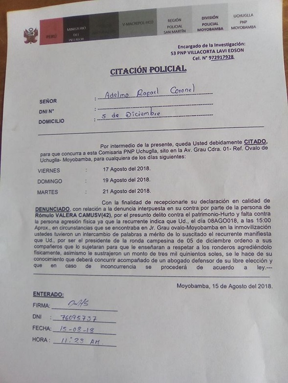 Moyobamba. El presidente de la ronda campesina del sector 5 de Diciembre, Adelmo Rafael Coronel, fue denunciado por el ciudadano de nombre Rómulo Valera Camus quien asegura que durante el paro de 24 horas del 08 de agosto impulsado por el FEDEIMAM, además de ser agredido fue víctima de robo por parte de un grupo de ronderos dirigidos por su persona quienes se habrían apropiado de 3 mil 500 soles. La denuncia fue interpuesta en la Comisaría de Uchuglla y está a cargo del suboficial de tercera Edson Villacorta Lavi, habiendo sido notificado con fecha 15 de agosto del año en curso a fin que se presente para el día 17, domingo 19 o martes 21 de agosto con la finalidad que responda a la grave acusación. Rafael Coronel en declaraciones a esta corresponsalía señaló que la denuncia carece totalmente de veracidad ya que de acuerdo a las afirmaciones en cuanto a la hora que habrían ocurrido los hechos él no se encontraba en el lugar. Manifestó que asistirá voluntariamente y demostrara que todo es parte de una patraña en su contra, donde no descarta que este siendo manejada con la única finalidad de afectar su imagen, toda vez que viene postulando al cargo de regidor provincial por el Partido Político “Vamos Perú” que encabeza Michel Aguilar Santa Cruz. (Franclin Laván)