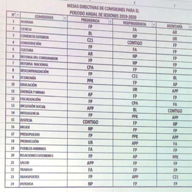 En el presente periodo anual de sesiones 2019-2020, las 24 comisiones se repartirán entre 12 bancadas a diferencia del anterior periodo 2018-2019 cuando se distribuyó entre las siete bancadas existentes en ese momento.