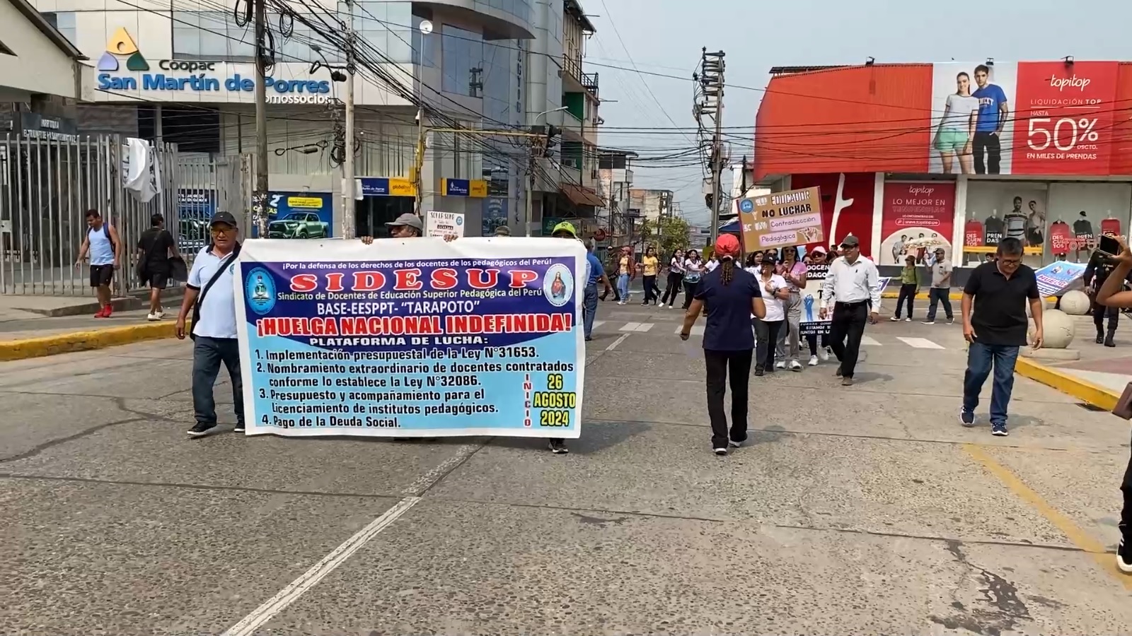 Los docentes del Instituto Superior Pedagógico de Tarapoto, que llevan seis días en huelga indefinida a nivel nacional, realizaron una manifestación por las calles de la ciudad acompañados por sus estudiantes. El objetivo de la movilización es sensibilizar a la población sobre sus demandas y presionar al gobierno central para que atienda sus reclamos.