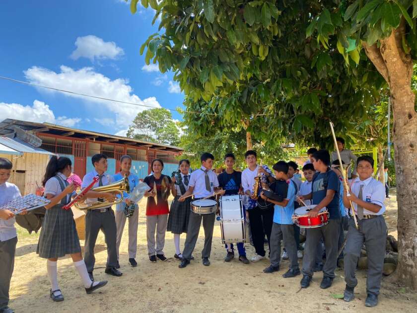 La banda de música donada está compuesta por instrumentos de percusión, trompetas, redoblantes, tambores, bombo, platos, liras y triángulos, que ahora servirán al colegio de más de 300 alumnos contar con una banda para los desfiles cívicos y otras actividades propias.