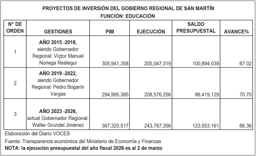 Según datos de la Ministerio de Economía y Finanzas, sistematizados a partir de su portal de transparencia económica, durante tres periodos de gestión regional se programaron S/968,257,260 para proyectos educativos. Sin embargo, solo se ejecutaron S/657,390,931, dejando un saldo presupuestal de más de S/310 millones que no se transformaron en infraestructura, equipamiento o mejoras educativas para miles de estudiantes de la región.