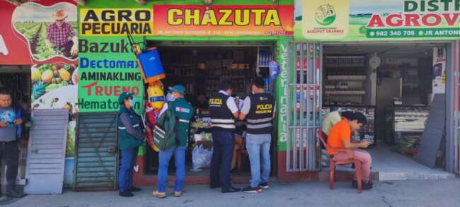 Durante un operativo ejecutado por la Fiscalía de Prevención del Delito, agentes de la Policía Fiscal intervinieron locales de venta de productos agroquímicos, con la finalidad de verificar la procedencia y si cumplen con los requisitos que establece el Servicio Nacional de Sanidad Agraria (SENASA).