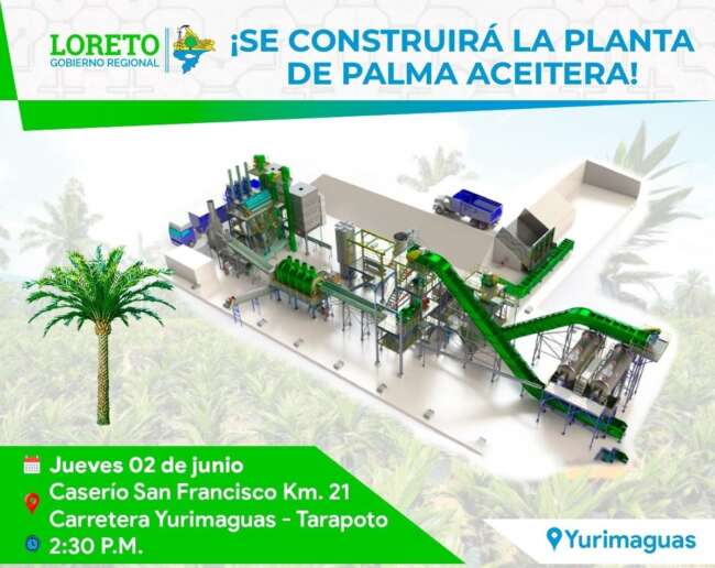 Elisban Ochosa Sosa, gobernador de Loreto, dará inicio a la obra al medio día como símbolo de inicio de este mega proyecto consistente en el “Mejoramiento de los Servicios de Apoyo al Desarrollo Productivo del Cultivo de Palma de Aceite, con Valor Agregado”, cuya infraestructura se edificará en el caserío de San Francisco ubicado en el Km 21 Km de la carretera Yurimaguas – Tarapoto