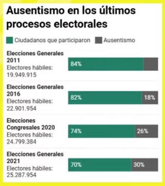 De acuerdo con los datos de los últimos procesos electorales, la tendencia es clara. En las Elecciones Generales 2011, con un padrón de 19,949,915 electores hábiles, la participación alcanzó un sólido 84%, dejando un ausentismo relativamente bajo. Era, en ese momento, una señal de compromiso ciudadano que aún resistía.